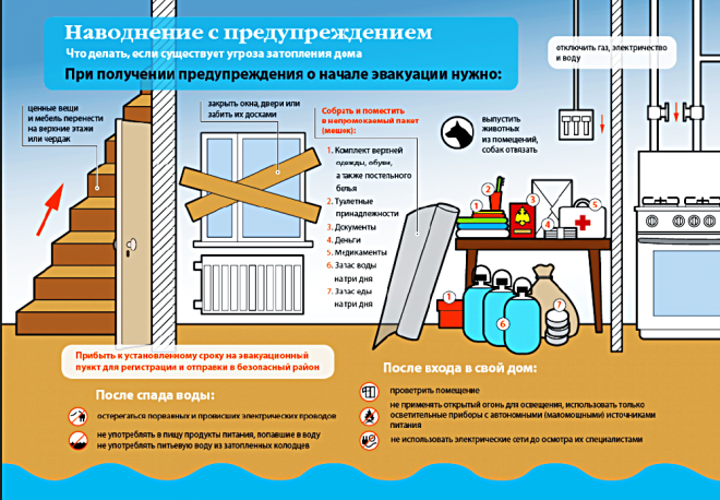 – перенесите имущество и материальные ценности в безопасное место (чердак, крыша) или уложите их повыше (на шкафы, антресоли);