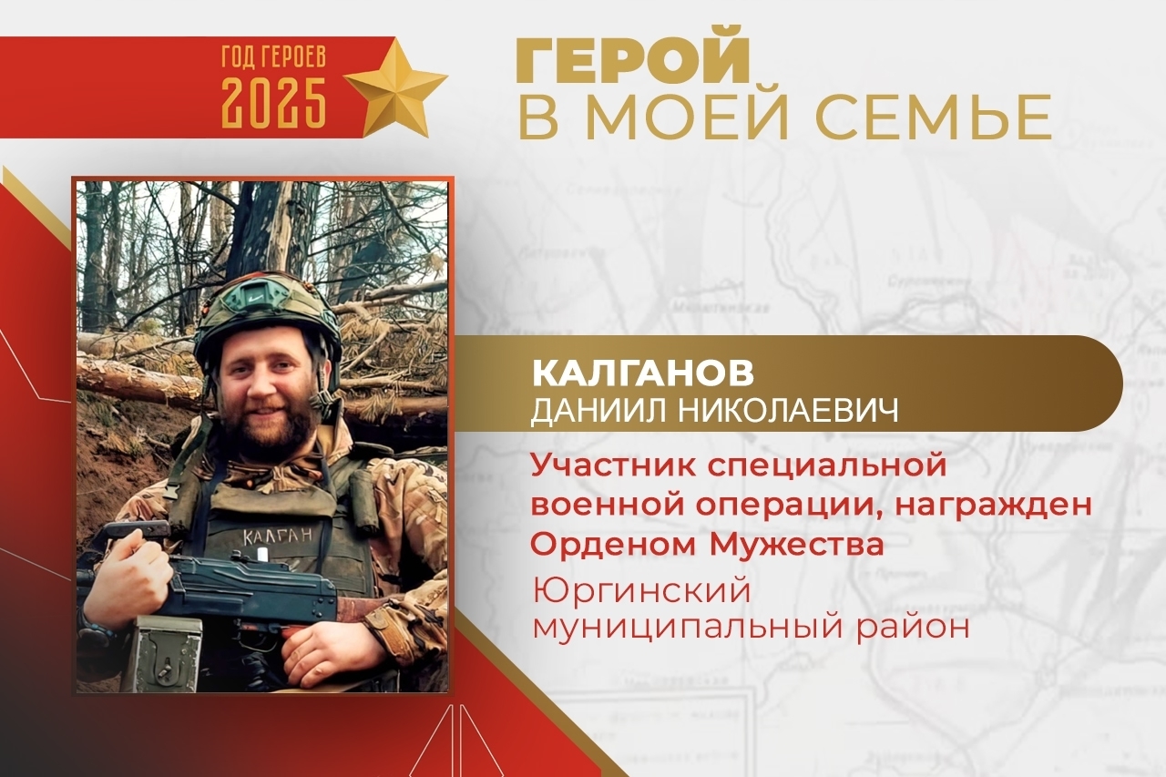 Калганов Даниил Николаевич (08.05.1994 - 11.07.2023) – участник специальной военной операции, гвардии рядовой, разведчик. Его имя навсегда вписано в историю семьи и страны, а посмертная награда – орден Мужества – говорит сама за себя. Родом мужчина из села Агарак, он всем своим естеством впитал суровую и честную сибирскую правду: быть верным до конца – себе, друзьям и долгу.