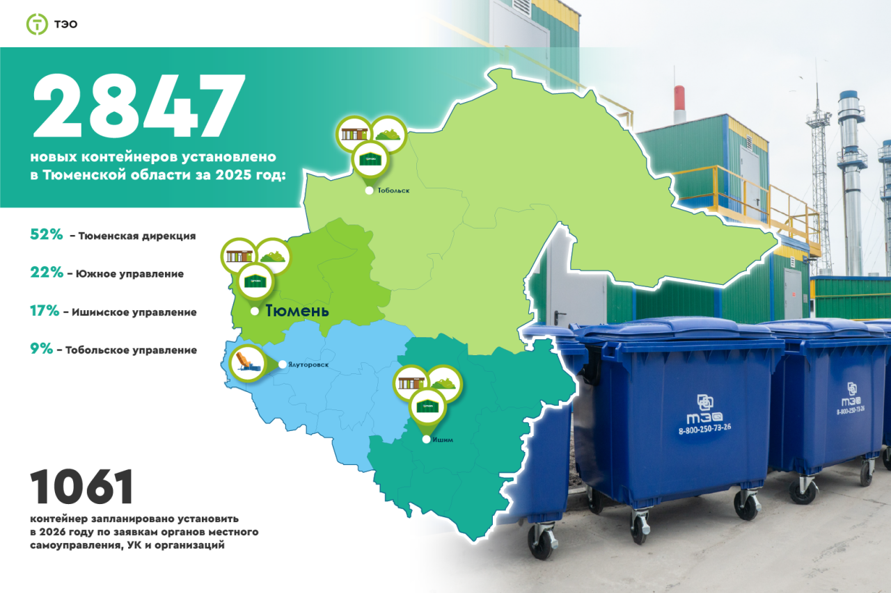 В 2025 году Тюменская область усилила инфраструктуру обращения с твёрдыми коммунальными отходами. Регоператор ООО «ТЭО» подвёл итоги работы по обновлению контейнерного парка за прошлый год и поделился планами на 2026-й.