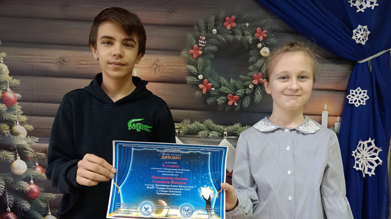 Участники театральной студии "Арлекин" Максим Семёнов и Лида Тюменцева на Всероссийском конкурсе национального детского театрального искусства "Звезды театра" заняли второе место. Занималась со школьниками Елена Витальевна Третьякова.