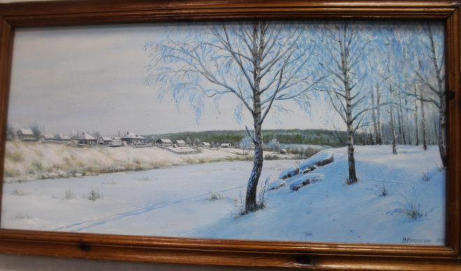 Сразу же обращают на себя внимание деревенские пейзажи. Вот вид на Свято-Троицкий храм Веналия Угрюмова, деревенская улица Светланы Сотниковой...